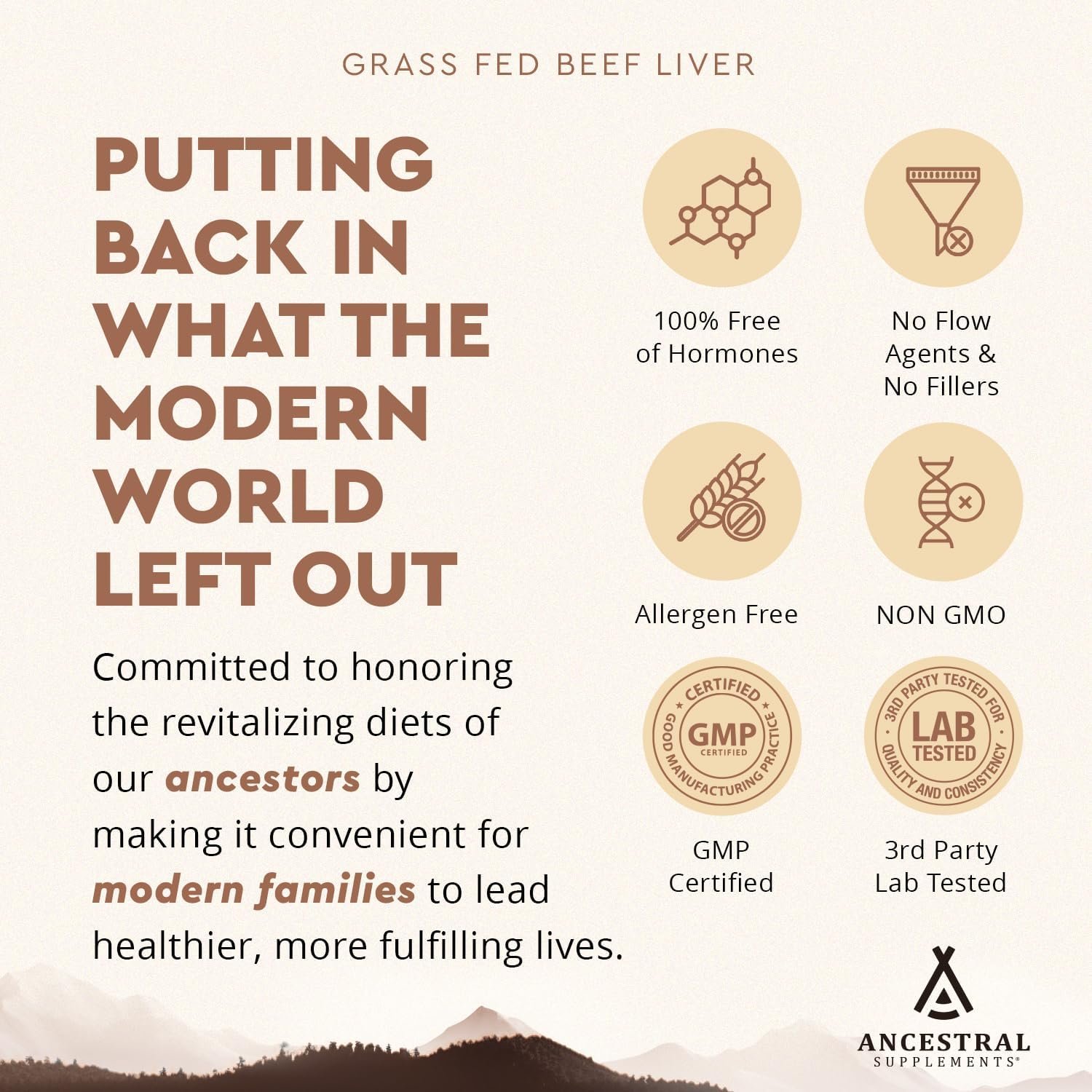 Ancestral Supplements Grass Fed Beef Liver 180 Capsules, Supports Energy Production, Detoxification, Digestion, Immunity and Full Body Wellness, Non-GMO, Freeze Dried Liver Health Supplement