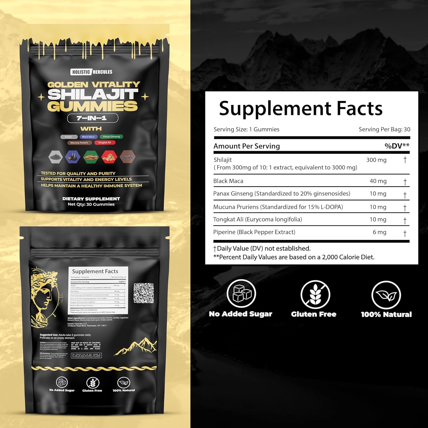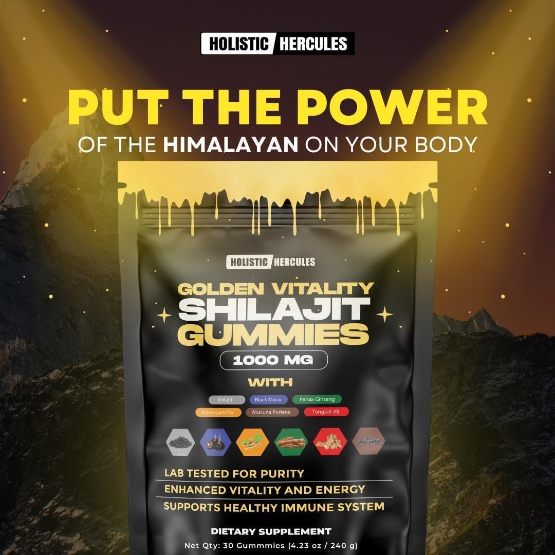 Premium Shilajit Gummies with Natural Botanicals Holistic Hercules Himalayan Gold Shilajit Gummies are made with a blend of Himalayan Shilajit and plant-based ingredients like Ashwagandha, Black Maca, Tongkat Ali, Panax Ginseng, and Mucuna Pruriens. These gummies are carefully crafted with a focus on natural origins and quality, offering an easy and flavorful way to incorporate botanicals into your daily routine.