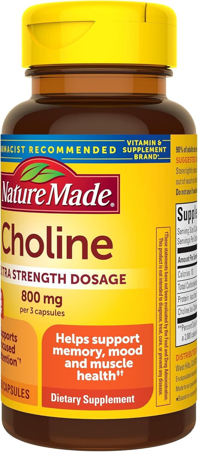 Brain health support supplement: contains one 60 count bottle of Nature Made Extra Strength Dosage Choline 800 mg per serving Capsules for a 20-day supply