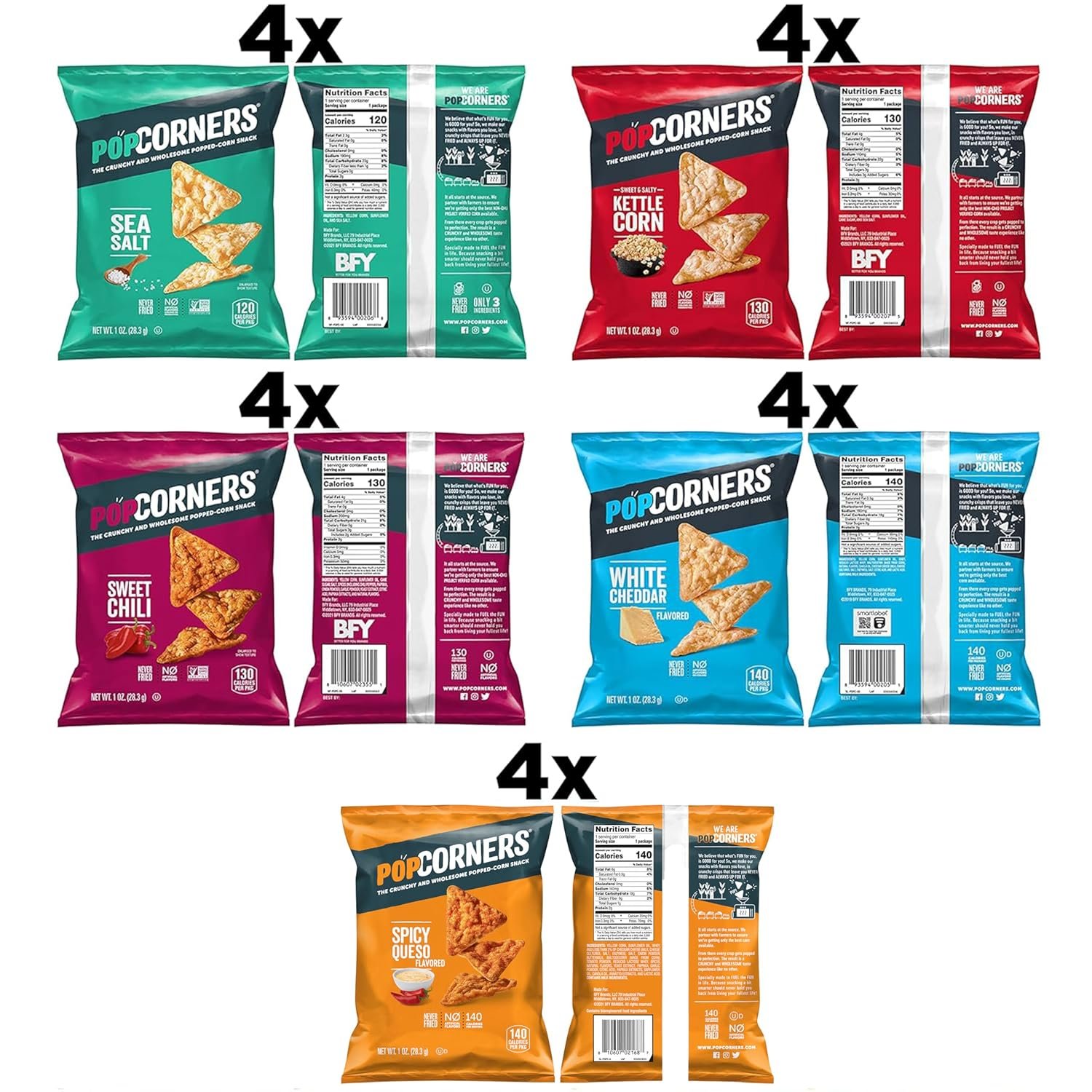 Includes 20 Pack of 1oz PopCorners variety snack pack chips: (4) White Cheddar, (4) Kettle Corn, (4) Sea Salt, (4) Spicy Queso, (4) Sweet Chili single serve snack chips