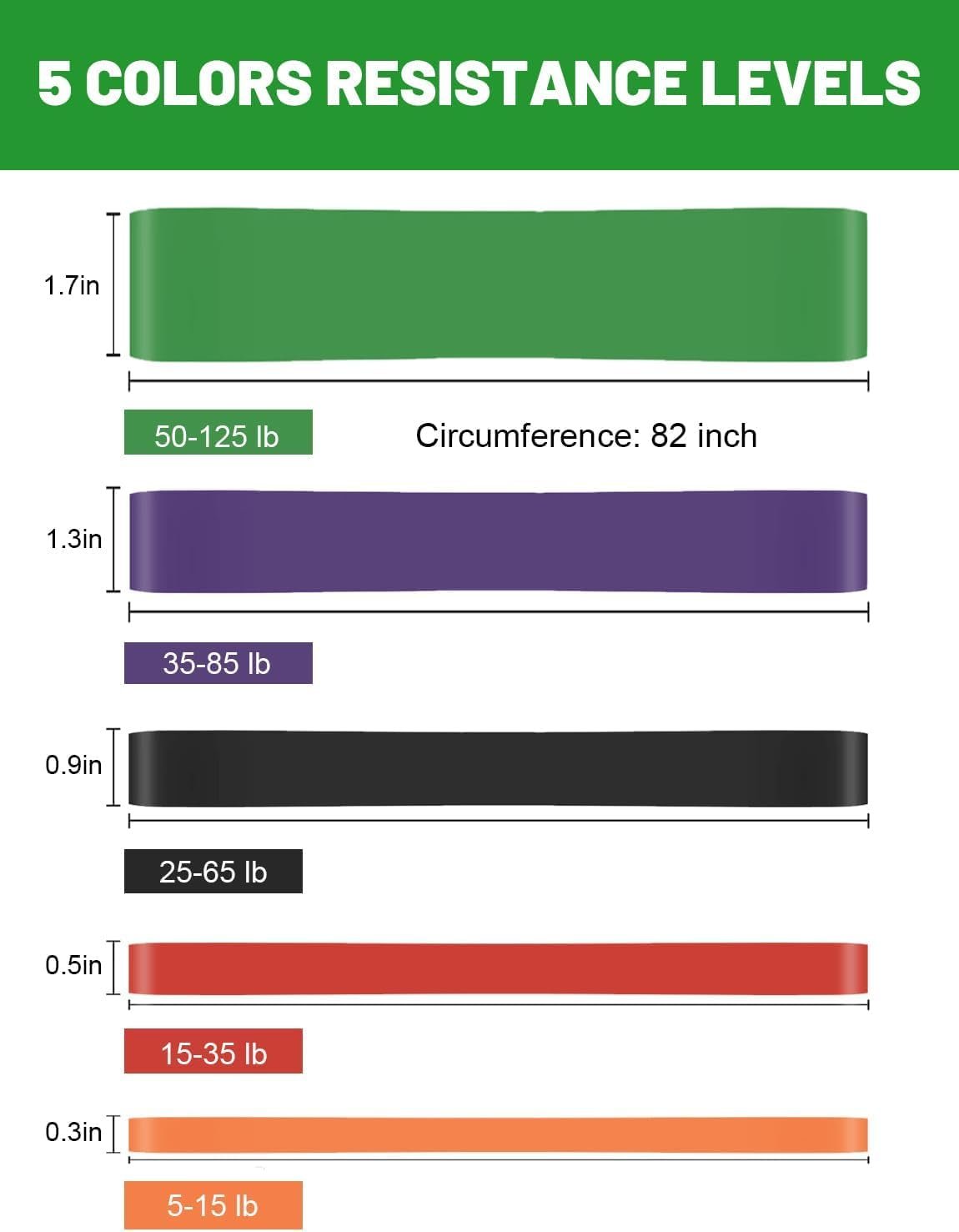 Package Included: 5 pull up bands, 1 carrying bag and 1 workout guide. Resistance bands are Orange 5-15 lbs, Red 15-35 lbs, Black 25-65 lbs, Purple 35-85 lbs, Green 50-125 lbs. Use these exercise bands to perform rows, pulls, raises, and fly workout sets to exercise your arms, back, hips, legs, chest, and abdominal region