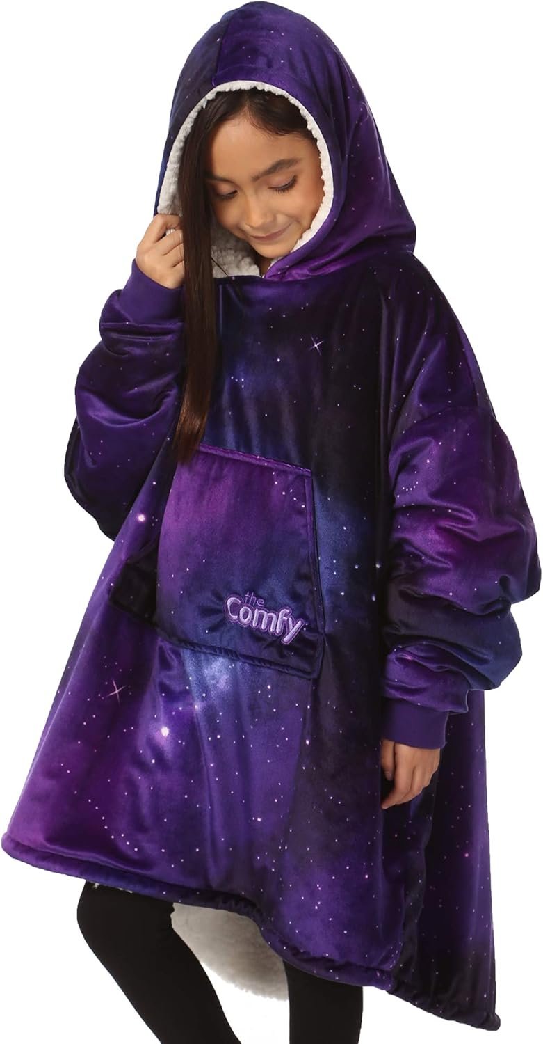 I got this for my daughter to wear at the bus stop since it’s designed so big that it slips over her other clothes easily. It worked so well keeping her extra cozy even when it was super cold. But she loves it so much she wears it to lounge in and sometimes sleeps in it. The fact that it was available in a purple galaxy print certainly had her extra excited. One of the best purchases I’ve made.