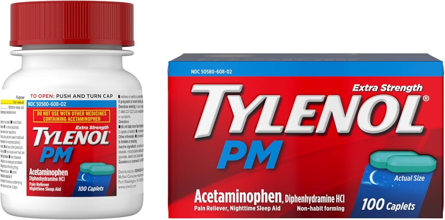 Tylenol PM Extra Strength Nighttime Pain Reliever and Sleep Aid Caplets help relieve minor aches and pains and help you fall asleep fast for a more restful sleep. This nighttime pain relief medicine provides 500 mg of acetaminophen and 25 mg of diphenhydramine hydrochloride in each caplet. Both a pain reliever and non-habit forming sleep aid, it is formulated to help you fall asleep and stay asleep while also relieving headaches and minor aches and pain. From Tylenol, the #1 doctor-recommended brand for pain relief and fever reduction, it can be used by adults and children 12 years and older, and is nonhabit forming when used as directed.