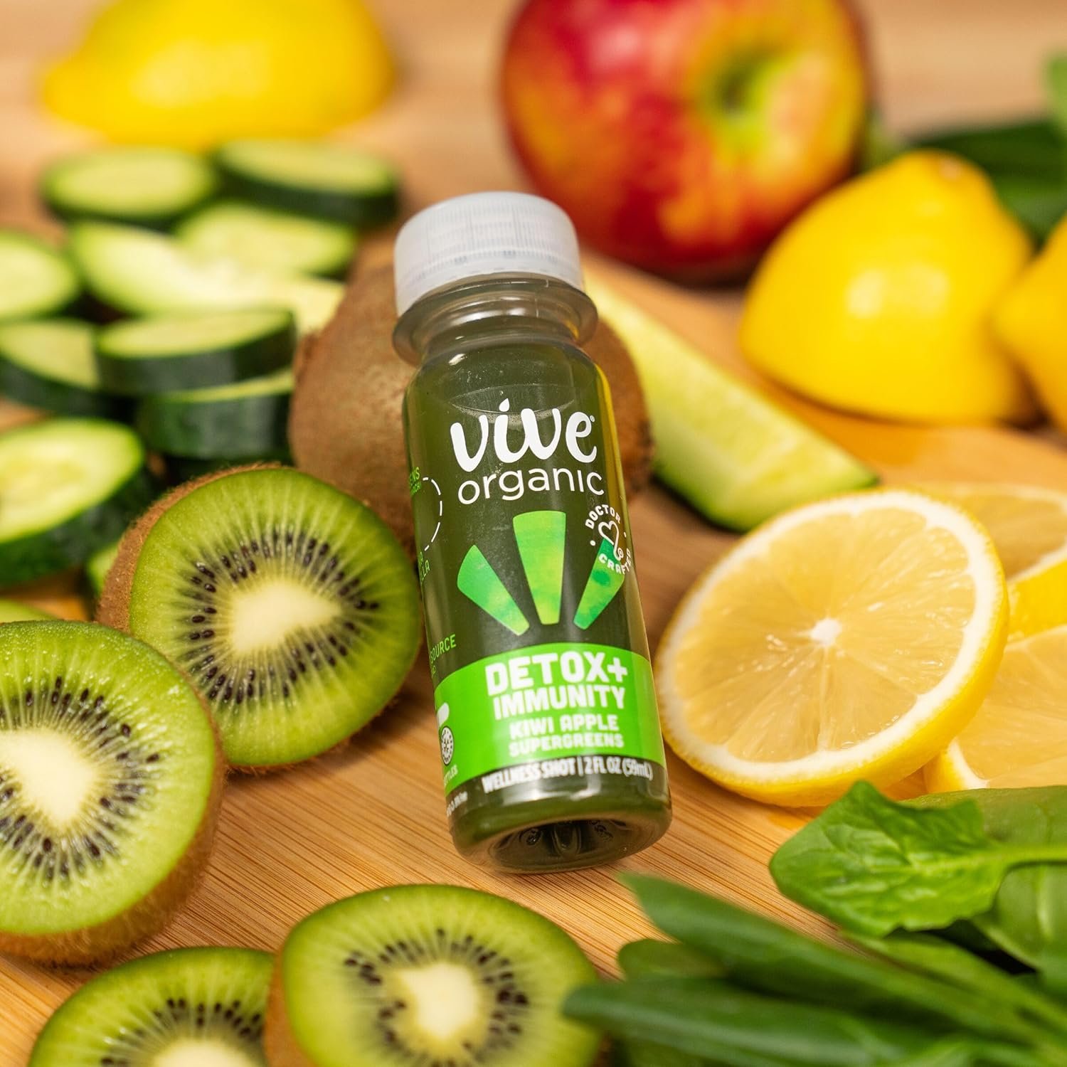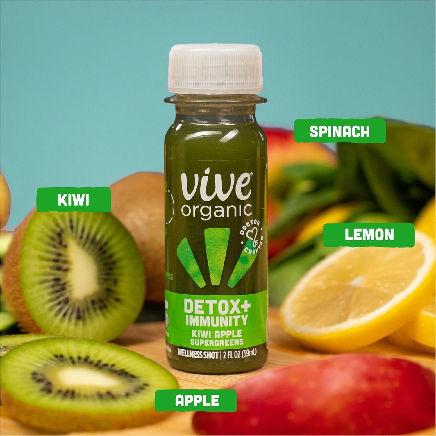 2-IN-1 DETOX IMMUNITY SHOTS: One (1) 2 fl oz bottle of Vive Organic Detox + Immunity Kiwi Apple Wellness Shot