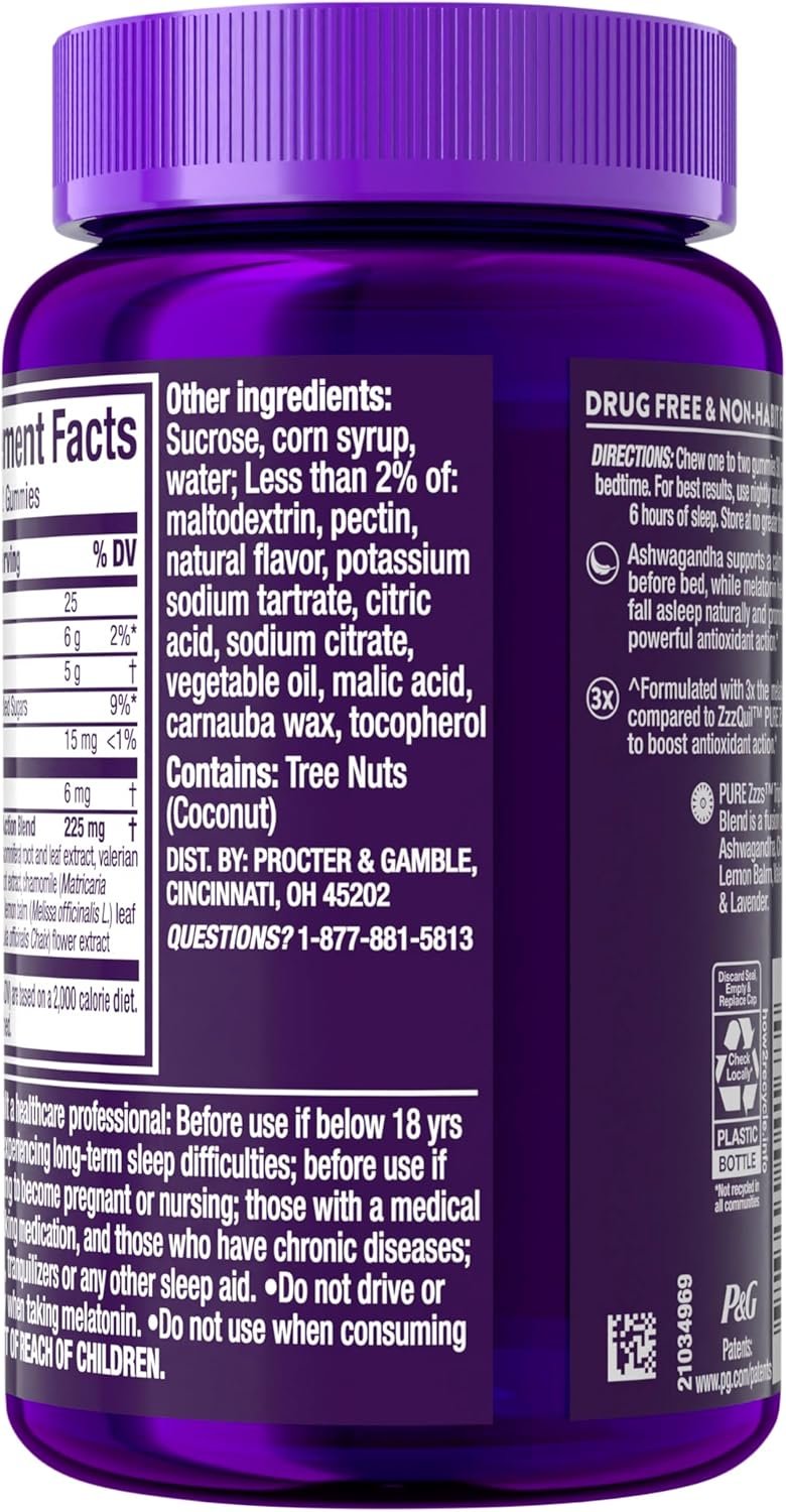 ZzzQuil PURE ZzzsTriple Action Melatonin Gummies are designed to help calm your mind and body before bed.* This dietary supplement sleep aid is formulated with 3x the melatonin (melatonin 6mg per serving, melatonin 3mg per gummy) compared to ZzzQuil PURE Zzzs to boost antioxidant action.* This melatonin and ashwagandha sleep aid works naturally with your body to support your body’s natural sleep cycle and soothe the consequences of occasional stress like sleeplessness, irritability, inability to concentrate*. They contain Ashwagandha, an adaptogenic herb to help you deal with occasional stress.* Ashwagadnha has been used for centuries in traditional Ayurvedic medicine. If you’ve been having occasional sleeplessness , whether it’s caused by stress, changes in your schedule, or just restless thoughts, you may be considering adding a melatonin sleep aid to your nighttime routine as a solution. ZzzQuil PURE Zzzs Triple Action Melatonin gummies are a great choice when you are dealing with occasional sleeplessness because they are drug-free and non-habit forming. This ZzzQuil PURE Zzzs melatonin sleep aid works naturally with your body to support sleep and is specially formulated with 6mg melatonin and ashwagandha. They also include a complementary blend of botanicals including chamomile, lavender, lemon balm, and valerian root. ZzzQuil PURE Zzzs was developed by the trusted experts at Vicks, because everyone deserves a great night’s sleep. ZzzQuil is the World’s #1 Sleep Aid Brand!† *These statements have not been evaluated by the Food and Drug Administration. This product is not intended to diagnose, treat, cure, or prevent any disease. †Source Euromonitor International Limited; Consumer Health 2024 Edition; Sleep Aids, all channels, retail selling price, Global Brand Name ZzzQuil 2023 data